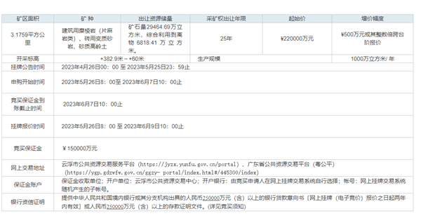 另外,采礦權出讓礦區(qū)面積3.1759平方公里(4763.84畝),礦區(qū)開采范圍內的土地以租賃方式使用。土地的租金、青苗補償款等費用合計人民幣70000萬元,由競得人承擔并在簽訂《非油氣采礦權出讓合同》后,在2023年7月30日前支付第一期款項人民幣35000萬元到云浮市云城區(qū)財政局指定銀行賬號,第二期在2023年10月30日前繳納剩余款項人民幣35000萬元。云浮市云城區(qū)人民政府負責協(xié)調完成礦區(qū)范圍(3.1759平方公里)租地后交由采礦權競得人使用,具體租地情況由競買申請人自行向云浮市云城區(qū)人民政府了解。
